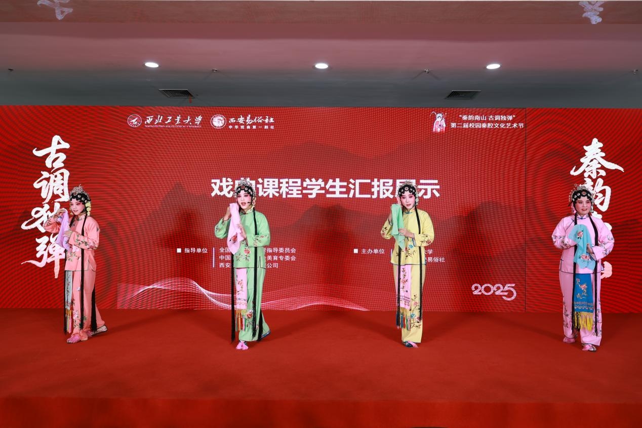 开幕式上,点点秦腔美育课程“秦腔舞台呈现”“秦腔艺术鉴赏”课程学生进行汇报展示,稚嫩、真挚的唱腔再现了“青春与传统对话”的生动图景。西安易俗社艺术家随后进行表演,让秦腔在校园演绎,为师生带来一场兼具艺术美感与文化温度的浸润表演。