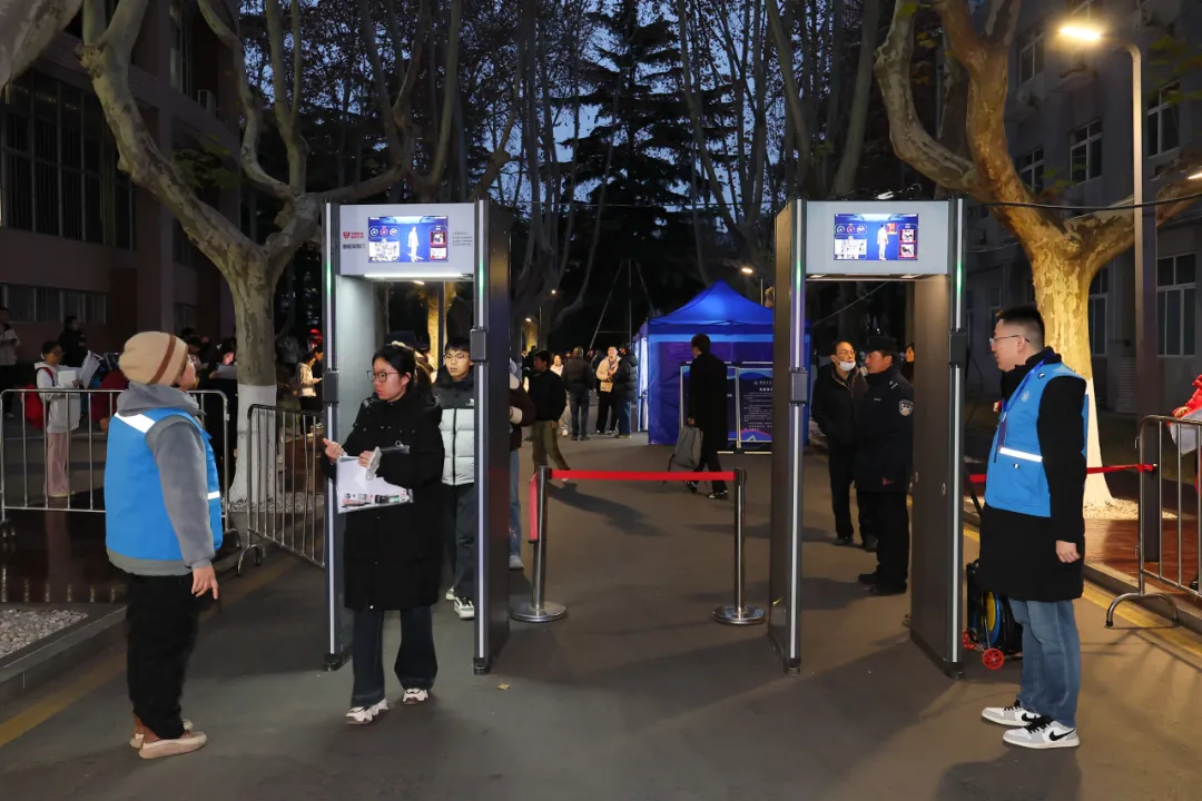 随后,考生在考务和安保人员的引导下,排队通过智能安检与人脸核验,并经考场门口二次安检、核验进入相应考场。