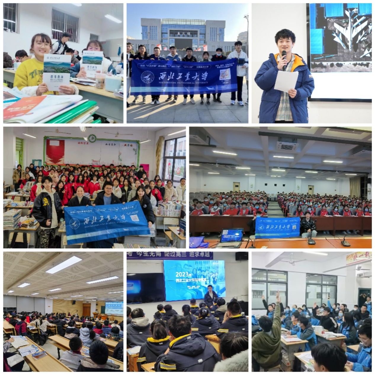 2023年,共计3100余名在校学生报名加入“学生大使”队伍,生源学校覆盖全国900余所中学,参与人数与覆盖中学均创历年新高。寒假期间,“学生大使”们回到母校,通过线下宣讲、新媒体直播、短视频制作、分发宣传材料、面对面访谈等形式,用亲身经历向学弟学妹们讲述西工大故事,充分展示介绍了学校的办学特色、人才培养、专业设置、杰出校友、特色“王牌班”、衣食住行等情况。