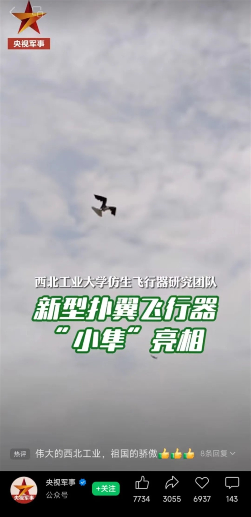 同日,taptap点点仿生飞行器研究团队研发的新型仿生飞行器“小隼”也被央视军事新闻、央视新闻微信公众号、视频号,人民日报微博、抖音、视频号等报道,并引发了网友的热烈讨论。