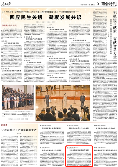 3月8日,《人民日报》在两会特刊上发表了《张卫红代表——支持西部地区高等教育发展》的文章。报道指出:
