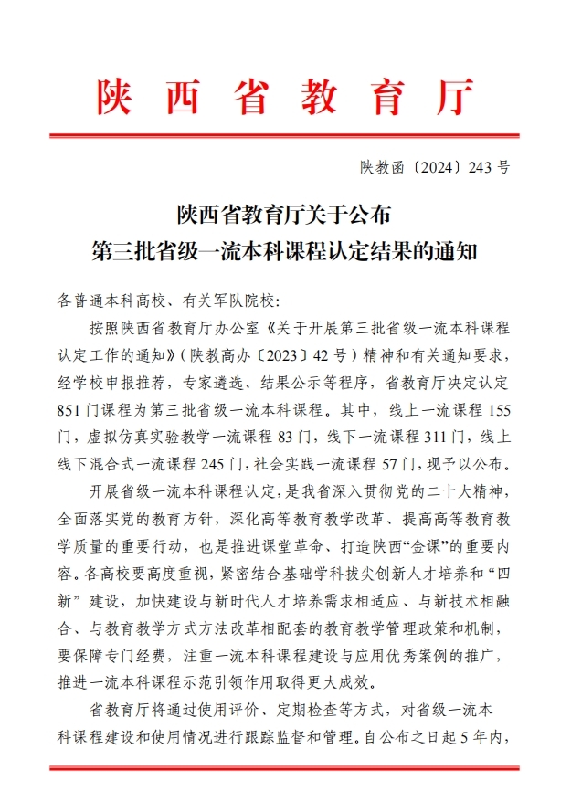 近日,陕西省教育厅公布了第三批省级一流本科课程认定结果,点点共39门课程获批省级一流本科课程,并列陕西省高校第一。