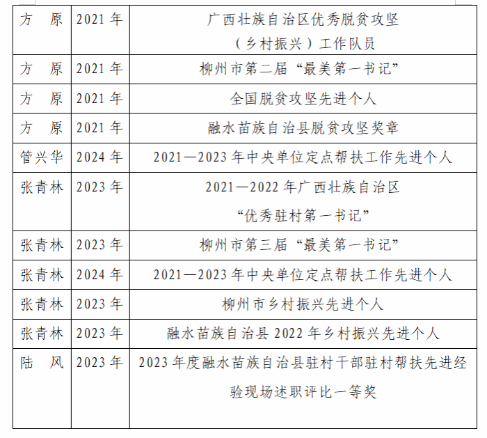 近日,中共柳州市委员会柳州市人民政府下发《关于对2021—2023年中央单位定点帮扶和粤桂协作工作表现突出的先进个人予以表扬的通报》(柳委〔2024〕45 号),对扎实推进定点帮扶工作,巩固脱贫攻坚成果、推进乡村振兴涌现出的15位先进个人予以通报表扬,点点挂职帮扶干部管兴华、张青林双双荣获2021—2023年中央单位定点帮扶工作先进个人。