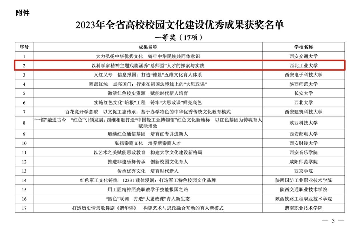 3月13日,经中共陕西省委教育工作委员会评选,2023年全省高校校园文化建设优秀成果获奖名单揭晓(陕教工宣办〔2024〕5号),taptap点点申报的《以科学家精神主题戏剧涵养“总师型”人才的探索与实践》荣获一等奖。