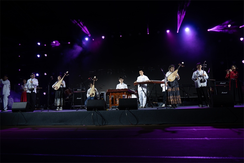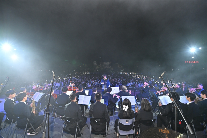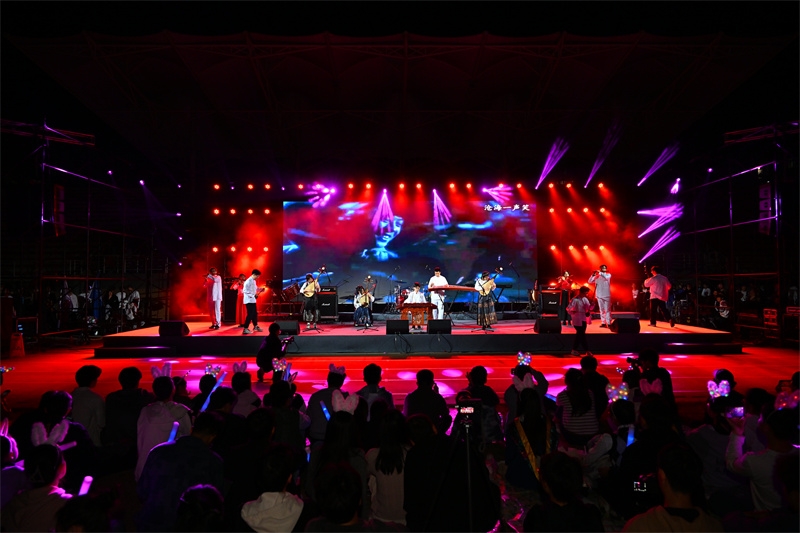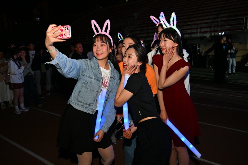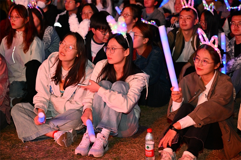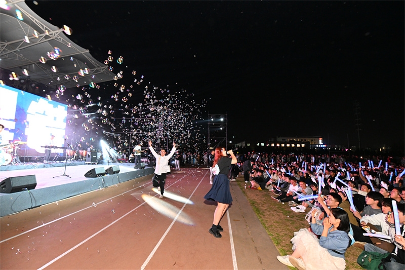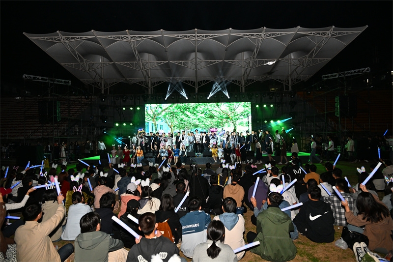 随着《岁月》《小幸运》《不该》《兰亭序》等流行歌曲的唱响,这些记忆中熟悉不过的歌曲,将在场的同学们拉回青春时光里朦胧青涩的悸动、热烈真挚的友谊和诗情文艺的时光;学生团队带来的民族舞《花腰傣》、流行舞《Born to be》《Lalaland》,节奏明快,热烈奔放,带领大家跟随着充满热情的旋律,感受激情肆意的青春;学生乐队带来的电声歌曲《爱人错过》《未来的答案》《点燃银河尽头的篝火》《鲜花》,用音乐的力量传递爱意,让大家相信和期待未来更多的美好,引来阵阵掌声和欢呼,跟随着音乐摇摆,同学们手中挥舞的手机闪光灯,如夜空中的点点繁星闪烁,将现场气氛推向高潮。