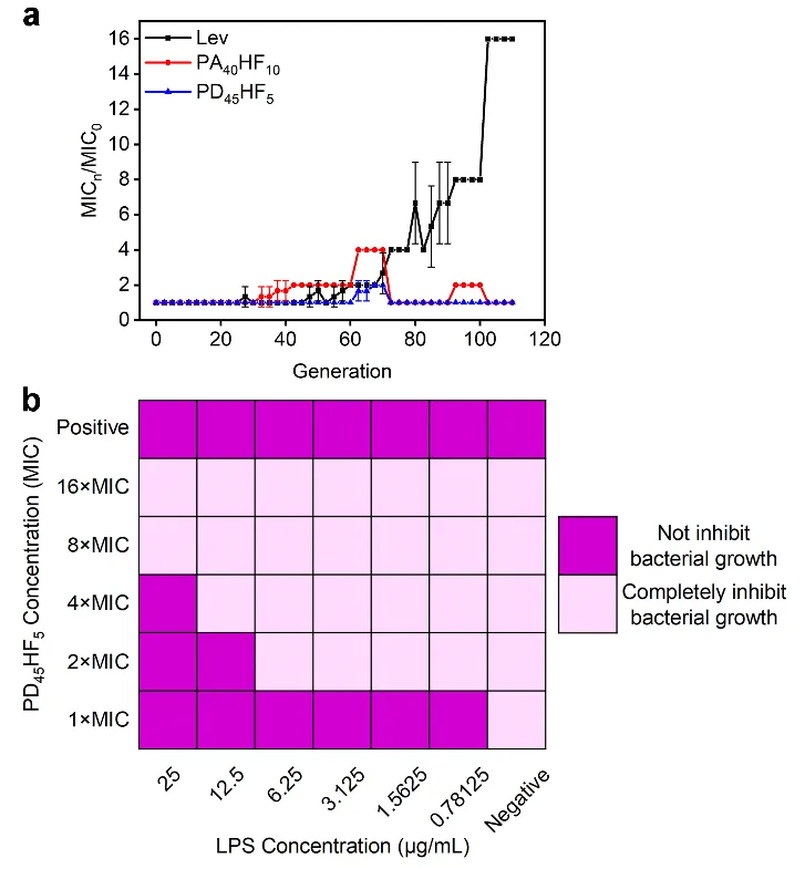 此外,两亲性含氟聚合物在延缓耐药性方面也展现出突出的优点。在连续传代培养超过100代的条件下,ESBL-EC对传统抗生素左氧氟沙星产生了明显的耐药性,而在同样条件下未对两亲性含氟聚合物产生耐药性。为了研究PD45HF5的革兰氏选择性抗菌性能,该课题组利用脂多糖抑制试验进行了探索。与革兰氏阳性菌不同,脂多糖作为革兰氏阴性菌外膜的独特组成部分,结果表明PD45HF5与脂多糖共孵育会以浓度依赖性方式对其抗菌效果造成显著影响,这可能归因于PD45HF5与革兰氏阴性菌表面的脂多糖具有一定的亲和作用。因此PD45HF5更易与革兰氏阴性菌的脂多糖进行结合,从而具有针对革兰氏阴性菌的选择杀菌性(图4)。
