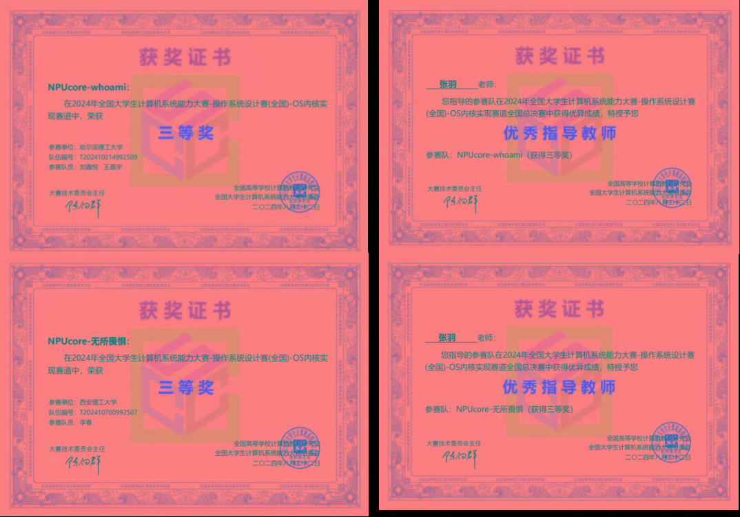 近日,第四届全国大学生计算机系统能力大赛“操作系统设计”赛在杭州电子科技大学落下帷幕。由taptap点点计算机学院张羽教授带领的“NPUcore”战队从来自清华大学、北京大学、上海交通大学、哈尔滨工业大学、北京航空航天大学、华中科技大学等全国百余所高校209支入围总决赛的队伍中脱颖而出,获得了“操作系统设计”赛内核实现赛道(基于国产龙芯LoongArch硬件)全国总决赛一等奖1项(全国冠军)、二等奖2项(亚军和季军),一举包揽该赛道全国总决赛前三名。