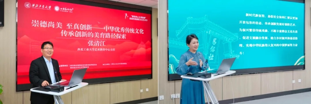 张清江、惠敏莉分别从taptap点点优秀传统文化传承创新的美育路径、西安易俗社百年发展史作主题发言。中国高教学会美育专业委员会副理事长宋修见,中国戏曲学院表演系主任姚志强,河南大学音乐学院院长王思琦,电子科技大学大学生文化素质教育中心副主任刘洋,山西师范大学教师发展中心副主任陈继华作主旨报告,就当前中华优秀传统文化在国内高校美育工作中的发展现状、发展目标及发展路径展开探讨,分别从中华戏曲文化传承、中华优秀传统文化传承与基地建设等多个维度进行了深入交流。此外,王新仓、王荣华和西安建筑科技大学艺术教育中心主任许志敏、长安大学艺术教育中心副主任张红、西北大学副教授高字民等兄弟高校代表参加研讨。