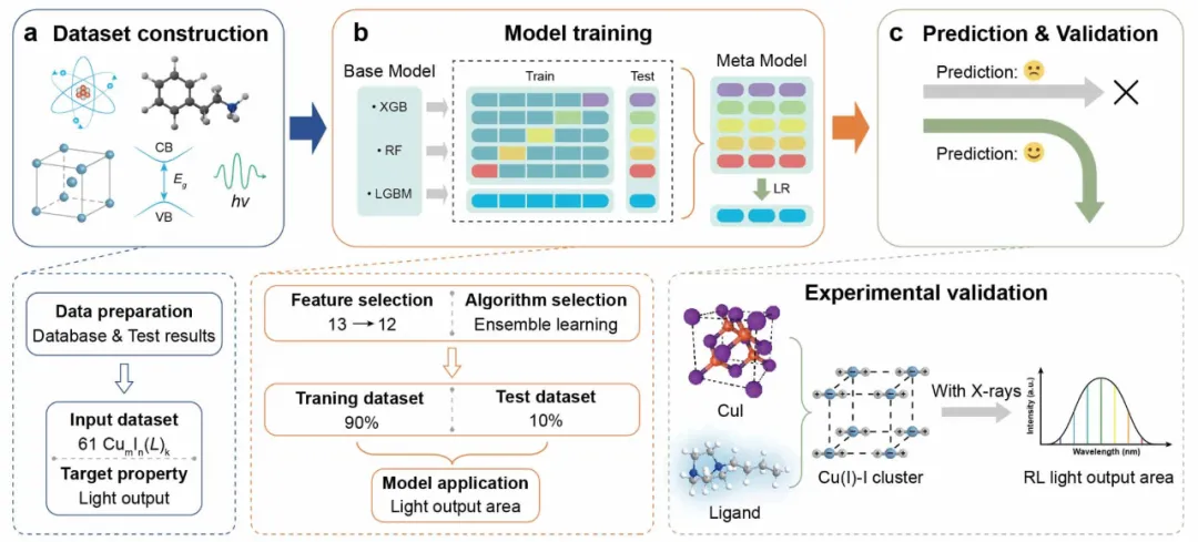 闪烁体是一种独特的光学材料,它可以吸收电离辐射发射出低能紫外线和可见光子。这一独特特性使得闪烁体在无损检测、X射线天文学、安全检查和医学成像等方面中具有广泛应用。铜碘团簇基闪烁体是一种由无机核和有机配体结合的有机-无机杂化材料,具有优异的X射线吸收能力、卓越的光致发光性能和半导体属性,展现出成为高性能闪烁体的巨大潜力。虽然无机核和有机配体的无数组合为材料提供了巨大的设计空间,但也给通过依赖材料合成和性能表征的传统实验方法有效开发闪烁体带来了障碍。目前,机器学习策略彻底改变了材料设计过程,以前所未有的效率获得了具有优异性能的新材料。这种创新方法为加速发现高性能铜碘团簇基闪烁体提供了一种切实可行的路径。