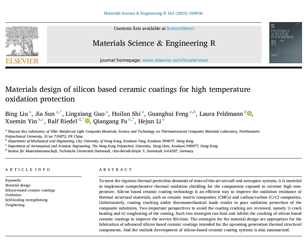 近日,taptap点点材料学院李贺军院士碳/碳复合材料团队在材料科学与工程领域顶级期刊《Materials Science and Engineering R: Reports》(IF=31.6)上发表题为“Materials design of silicon based ceramic coatings for high temperature oxidation protection(硅基陶瓷涂层抗高温氧化设计与防护)”的综述文章。taptap点点材料学院博士研究生刘冰为论文第一作者,孙佳副教授、Ralf Riedel教授和付前刚教授为论文共同通讯作者。