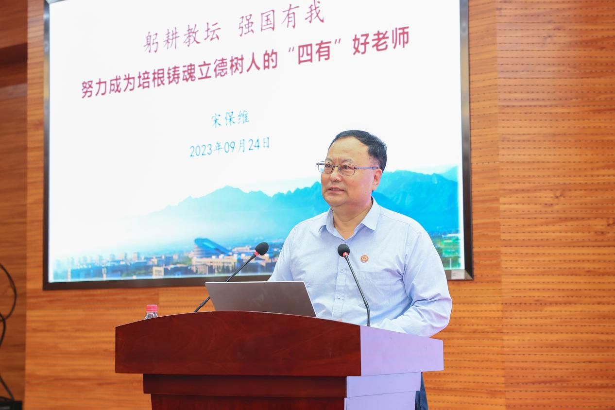 校长宋保维为全体新入职教职工作题为《躬耕教坛 强国有我 努力成为培根铸魂立德树人的“四有”好老师》的入职培训。宋保维从学校概况、建设成效、创新发展三个方面带领新入职教职工纵览西工大发展历程,校史校情校貌,介绍了校园环境条件、人才培养质量、高水平师资建设、科技创新实力、社会服务贡献、国际合作新局面等方面的建设成效,并强调了学校的发展思路和重要举措。宋保维对新入职教职工提出了四点希望:一是有理想信念,做“心有大我、至诚报国”的好老师。希望大家要以理想信念为基,用远大志向、纯粹的心灵、高尚的节操引领学生前行。二是有道德情操,做“言为士则、行为世范”的好老师。希望大家用模范的言行举止为学生树立榜样,用高尚的人格魅力引领学生的心灵,努力成为塑造学生品格、品行、品位的“大先生”。三是有扎实学识,做“学识渊博、追求卓越”的好老师。希望大家学识渊博,视野开阔,充满智慧,与时俱进,追求卓越,不断汲取新知识,更新自己的知识结构,积极回应新的挑战。四是有仁爱之心,做“乐教爱生、甘于奉献”的好老师。希望大家在严爱相济的前提下晓之以情、动之以理,让学生“亲其师”“信其道”。