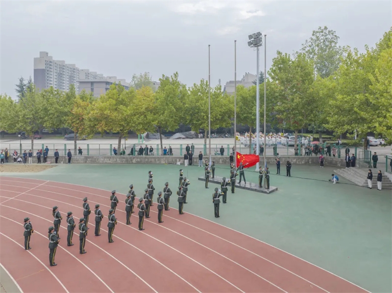 鲜艳的五星红旗,在国旗队的护卫下,缓缓升起,全场师生齐唱国歌,庄严而自豪。